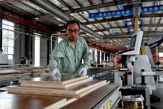 在费县云峰莫干山装饰材料有限公司,工人在加工定制家具面板。