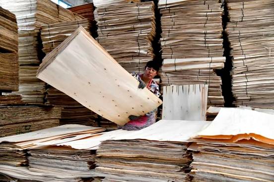 在费县坤林木业有限公司,工人在整理板材原料。