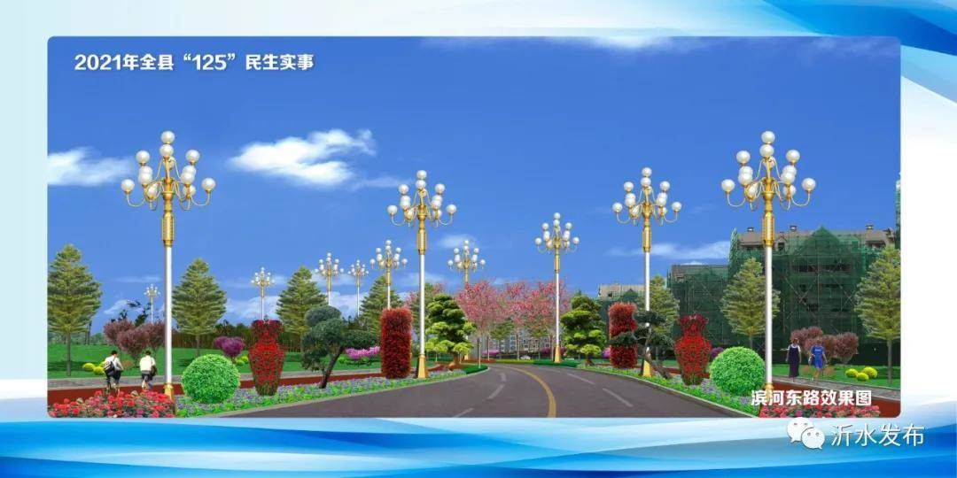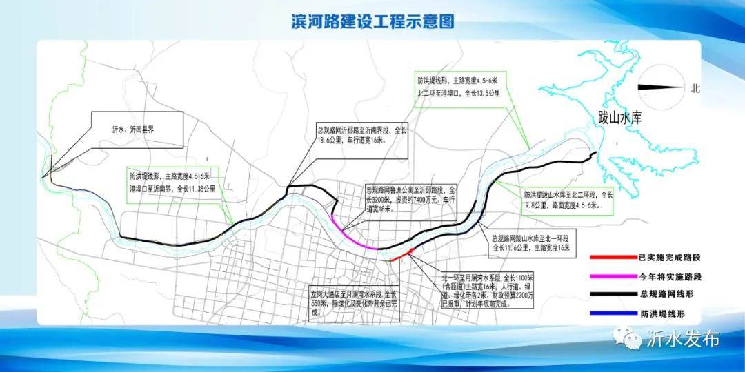 滨河西路建设工程,北起鲁洲公寓,南至金澜湾大桥,全长 3600米,规划道路红线31米,车行道18米。项目于2020年11月4日开标,由沂水县市政工程公司中标,计划5月底完成。通车后,将有效缓解城市交通压力,对拓展城市发展空间、改善群众出行环境、构建综合交通运输网络以及推动沂水经济社会发展具有重大意义。