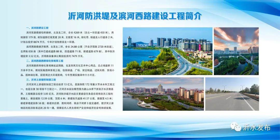 沂河防洪堤及滨河西路工程包括沂河防洪堤、滨河西路建设、沂河西路快速路建设三项工程,计划总投资5.1亿元。沂河防洪堤工程是国务院172项重大节水水利工程之一,也是治淮38项骨干工程之一。北起跋山水库,南至沂南县界,在现有防洪工程的基础上,新筑堤防12.59公里,顶宽6米;新建防汛道路41.57公里,路面宽4.5米;新建穿堤建筑物58座;新建田庄桥、胜利河桥、姚店子河桥3座交通桥,使沂河上游地区的防洪标准达到20年一遇,以保障人民生命财产安全和经济社会可持续发展。
