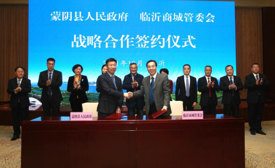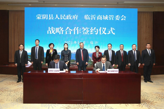 蒙阴县委副书记、县长武光锋代表县政府与临沂商城管委会签约战略合作协议。仪式由临沂商城党工委副书记、管委会副主任王东主持,与会人员共同观看了蒙阴县招商宣传片和临沂商城宣传片。