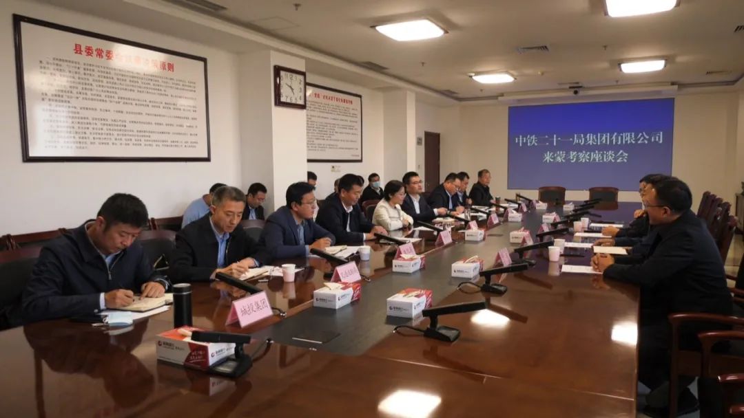 10月11日,中铁二十一局集团有限公司党委书记、董事长庄纪栋,中铁二十一局集团有限公司轨道公司党委书记、董事长公绪论一行到蒙阴县考察,并召开座谈会。市政协副主席、蒙阴县委书记王丽云,县领导王俊国、孙令杰、危志国参加活动。