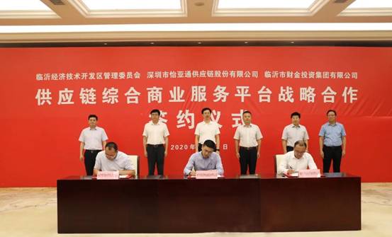 7月22日,临沂经济技术开发区管委会、深圳市怡亚通供应链股份有限公司、临沂市财金投资集团战略合作签约仪式举行。市委常委、常务副市长侯晓滨,深圳怡亚通股份有限公司副总裁李程,市政府党组成员、经开区党工委书记、管委会主任陈一兵,市政府副秘书长王鑫,市财金集团党委书记、董事长王兴助出席签约仪式。